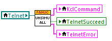 ConnectToRobot.vi allows you to connect to the robot using its IP address. Booleans enable or disable connection via Telnet, FTP and SNPX protocols. Telnet also requires a password. For FTP, you need to enter the user and password.